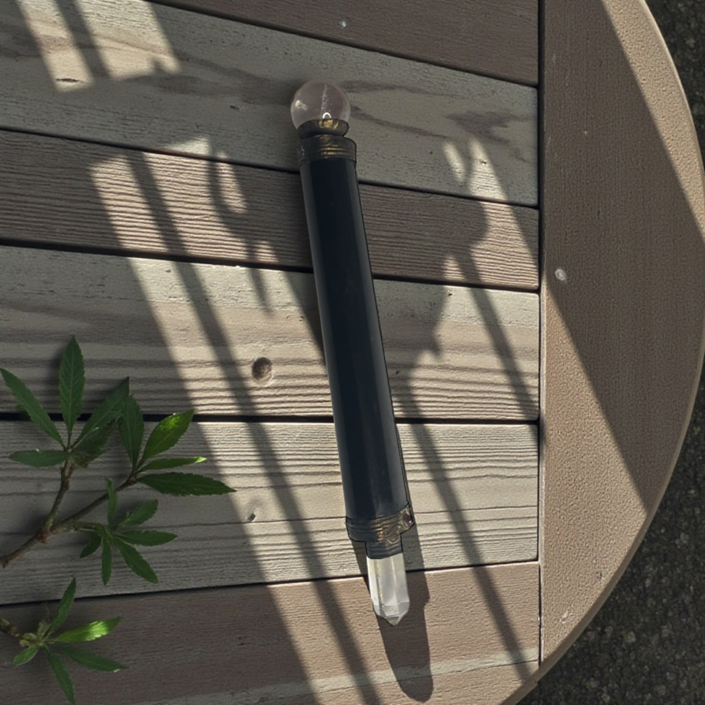 The Black Tourmaline Healing Stick is a powerful tool for protection, grounding, and energy purification. Black Tourmaline is renowned for its ability to absorb and neutralize negative energy, protect against psychic attacks, and shield against EMF radiation, while the clear quartz point amplifies and directs energy for precise healing work.