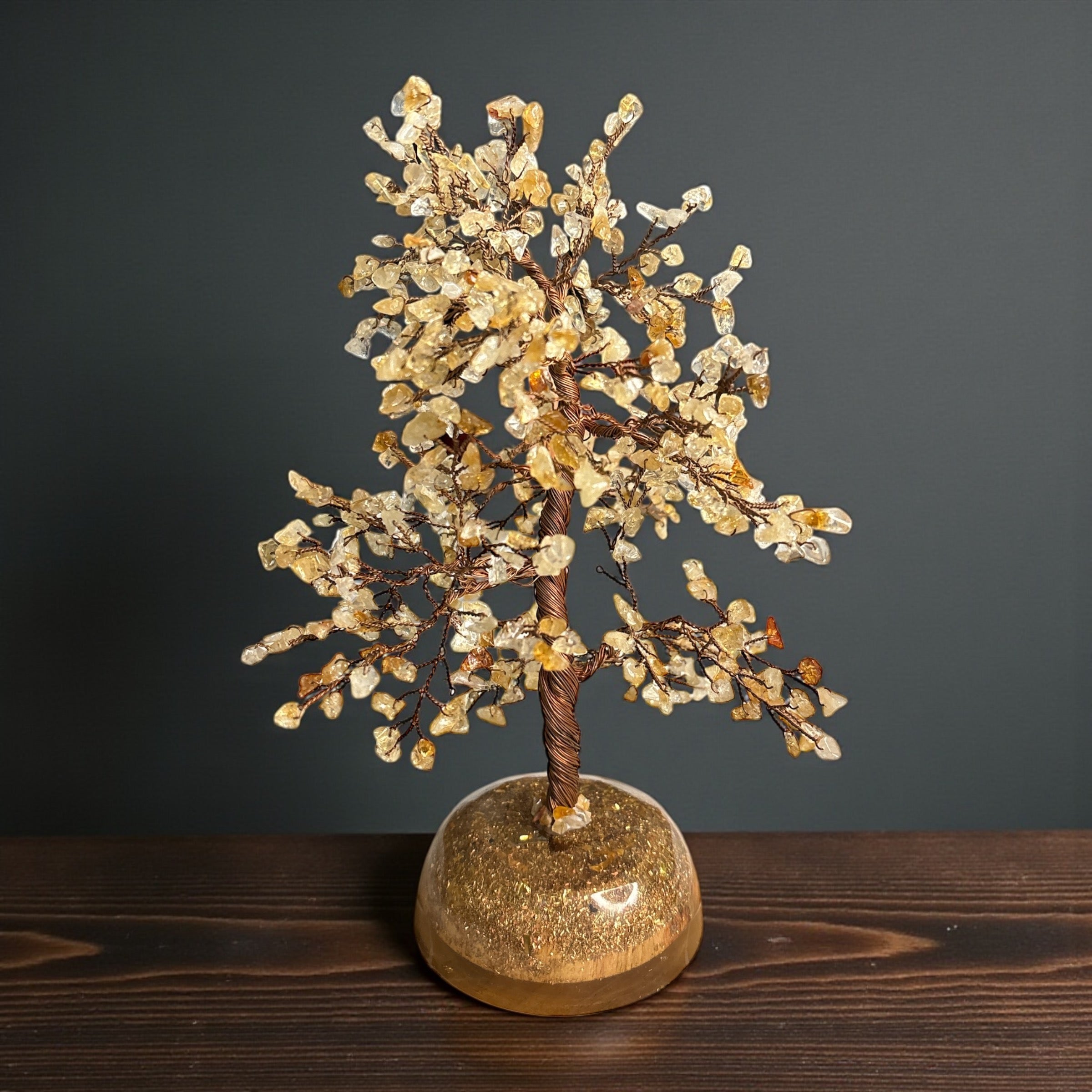 The Citrine Crystal Tree is a handcrafted masterpiece made with natural citrine chips intricately twisted on copper wire and mounted on a powerful orgone base. Citrine is known as the “Merchant’s Stone”, renowned for attracting wealth, prosperity, and abundance.