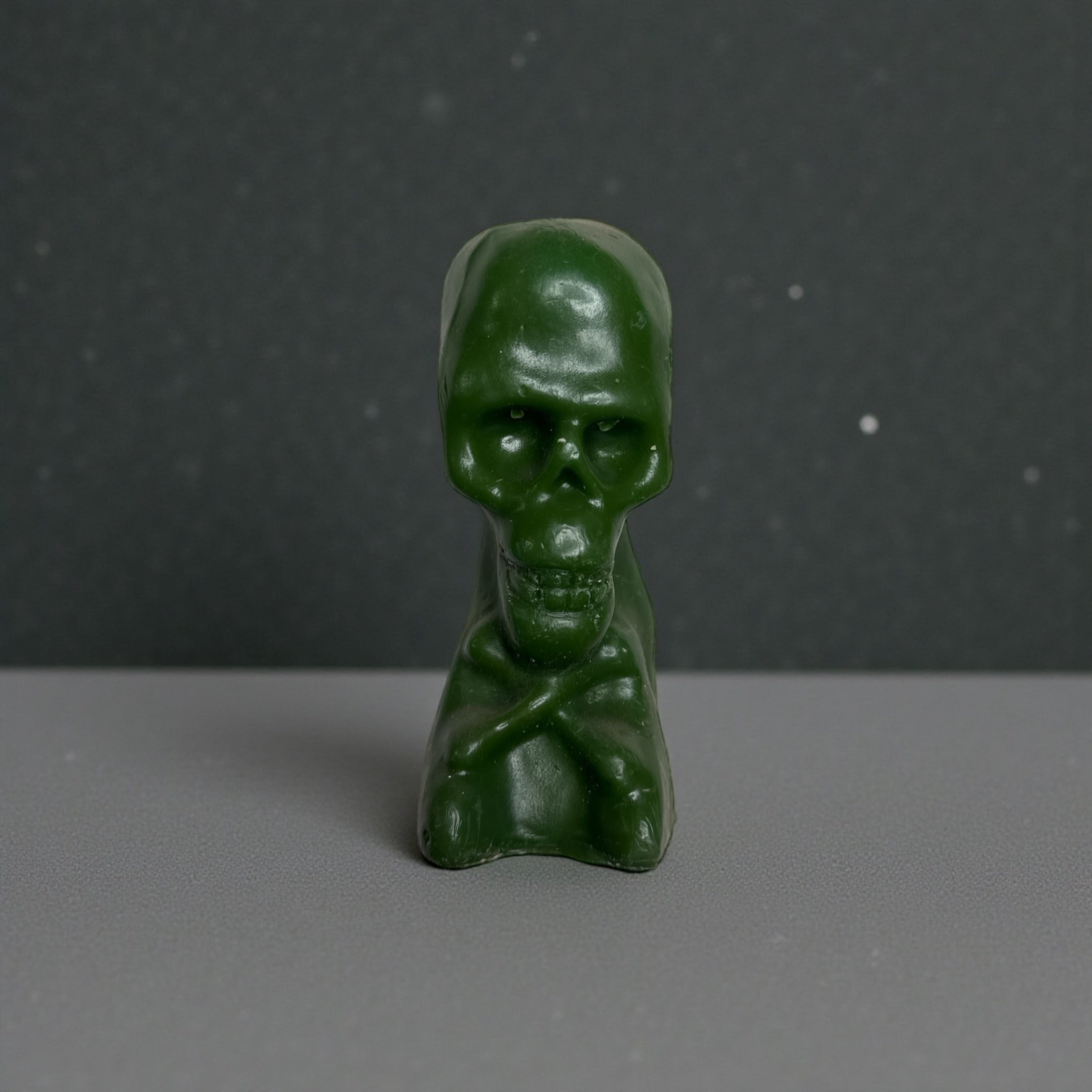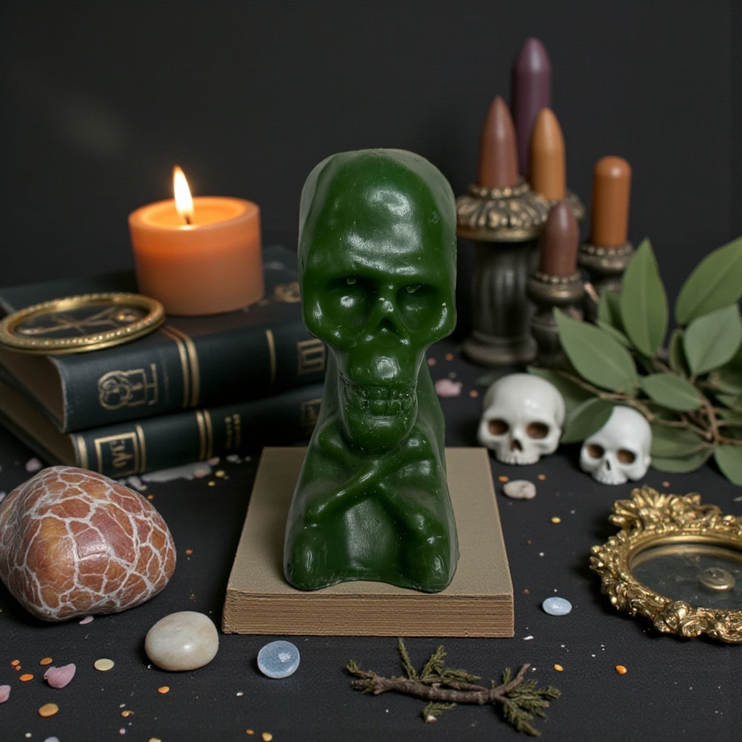 The Green Skull Spell Candle is a ritual candle designed to combine the energies of transformation and abundance. The skull symbolizes wisdom, endings that lead to new beginnings, and personal growth, while the green color represents prosperity, renewal, and manifestation.