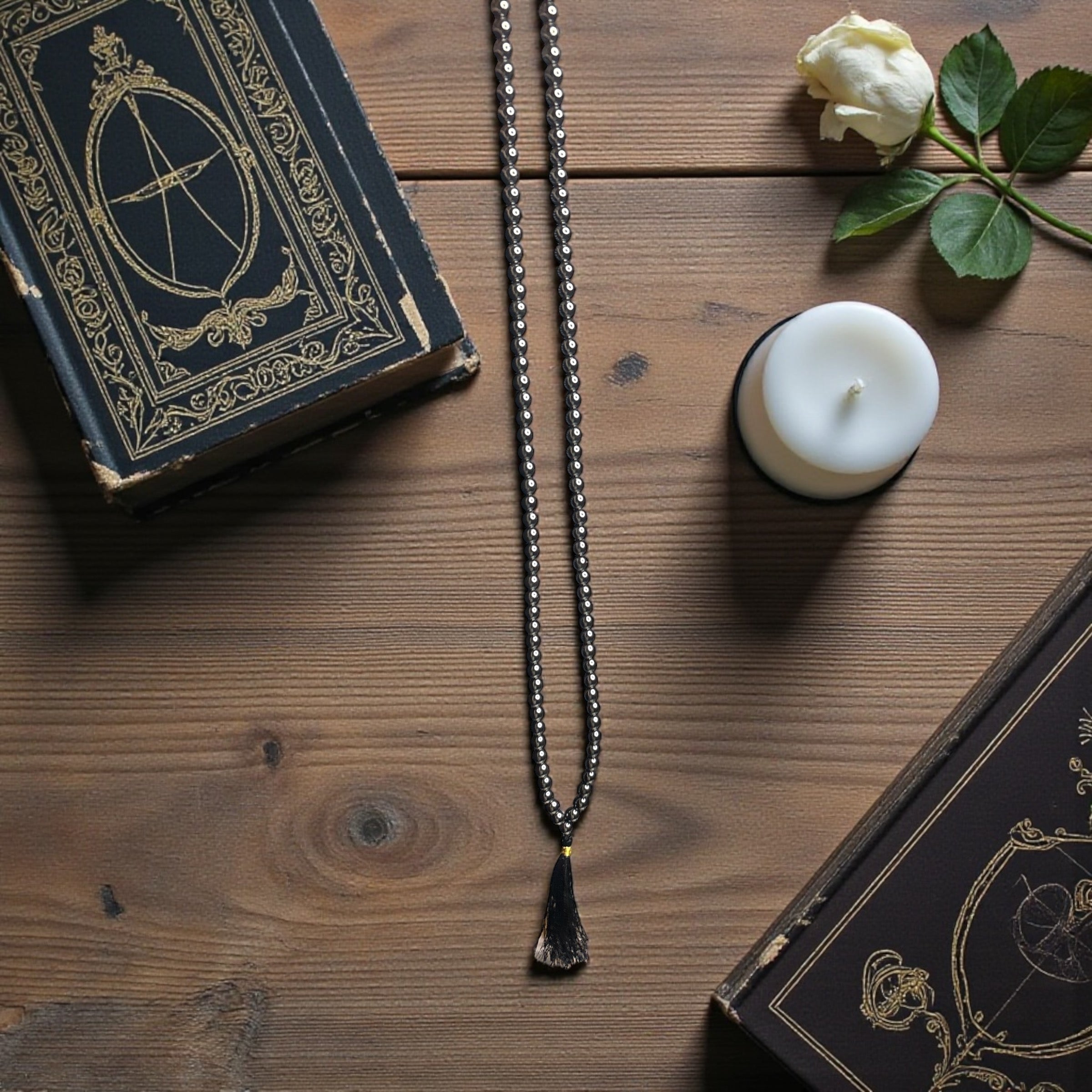 This traditional 108-bead Hematite mala supports disciplined spiritual practice and deep concentration. Hematite resonates strongly with the Root Chakra, anchoring scattered energy, calming the mind, and creating a protective energetic shield.