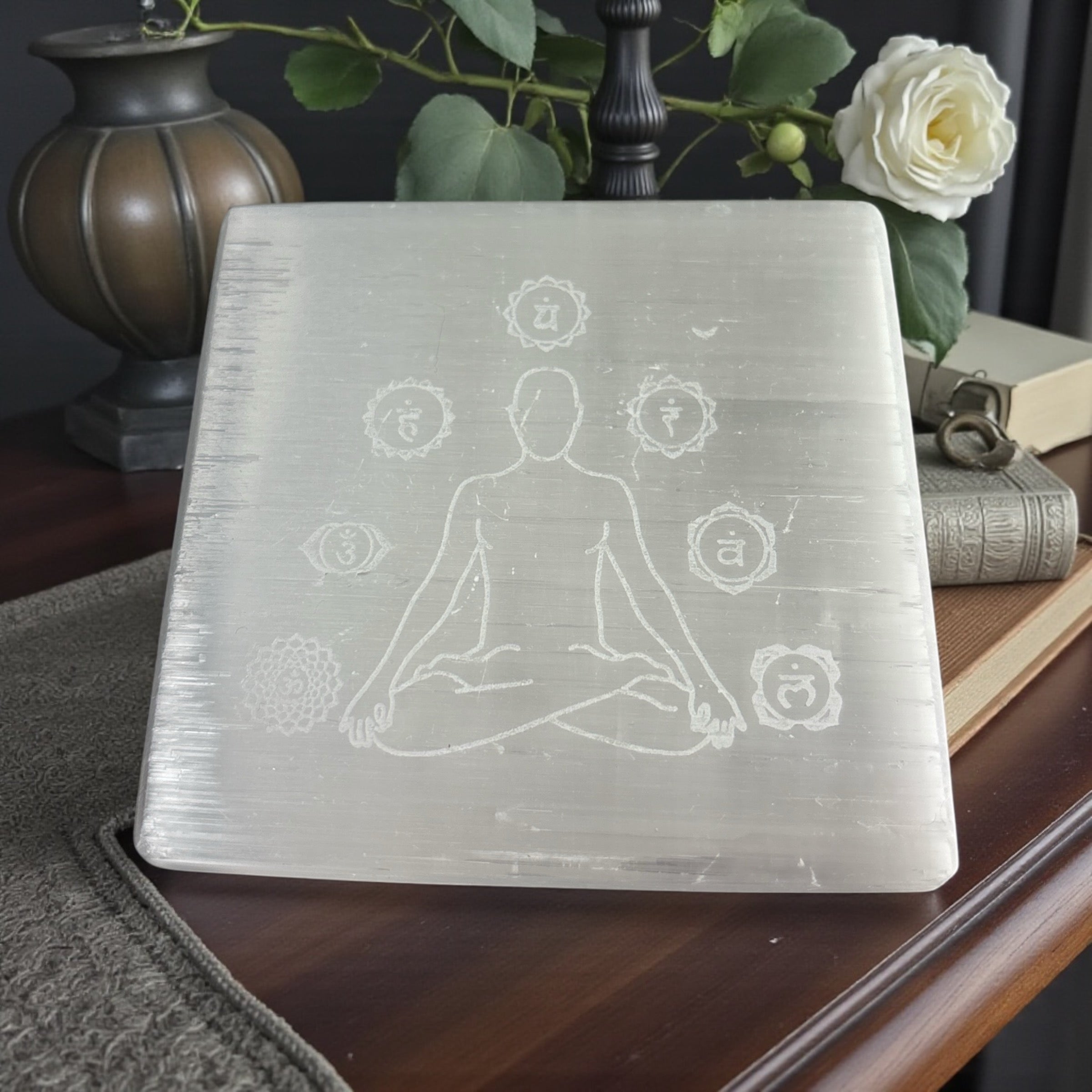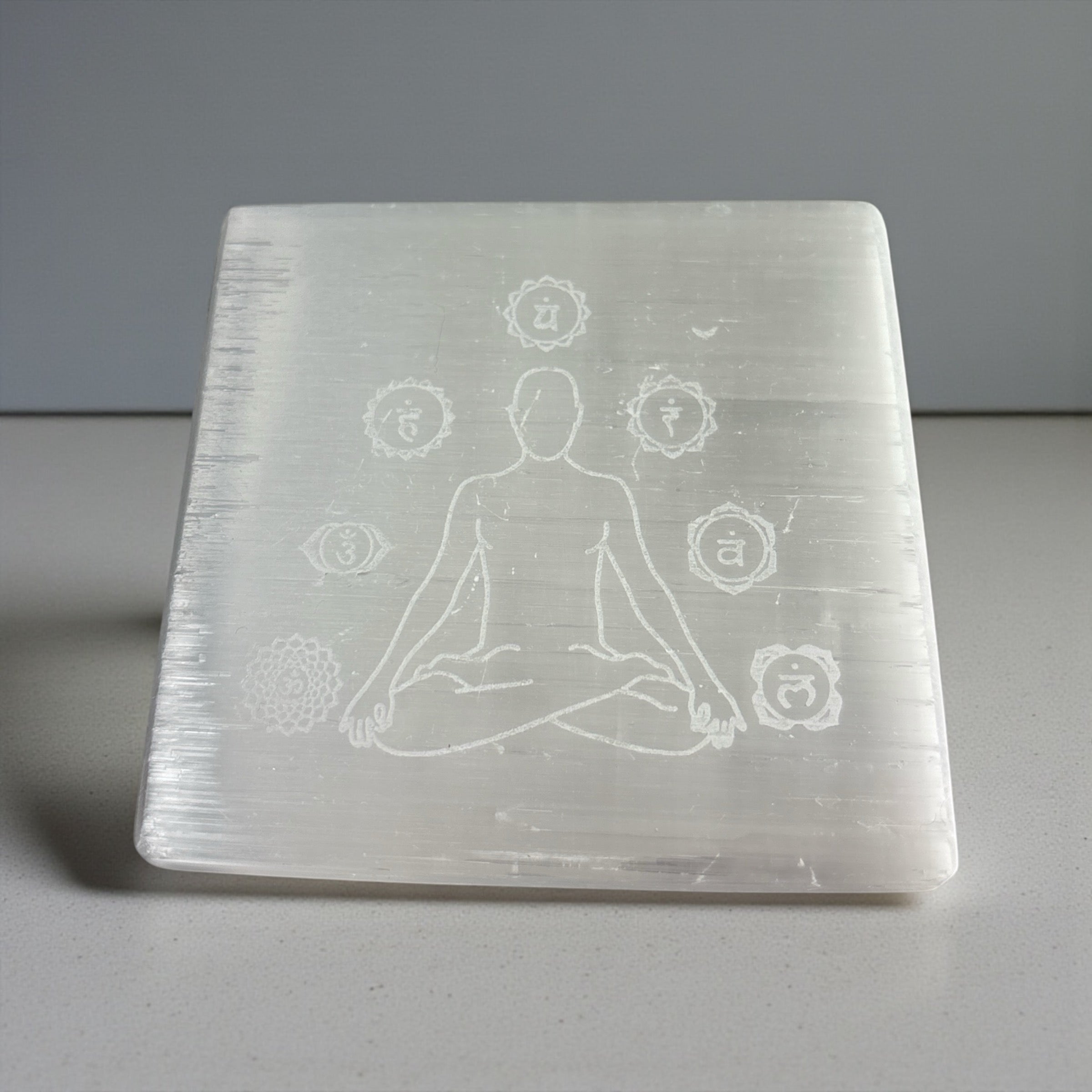 Align, cleanse, and activate your energy centers with this Selenite 7 Chakra Square Plate, beautifully engraved with the Seven Chakra symbols. Crafted from natural selenite, this 3-inch square plate is a powerful tool for chakra balancing, crystal charging, meditation, Reiki, and altar use.