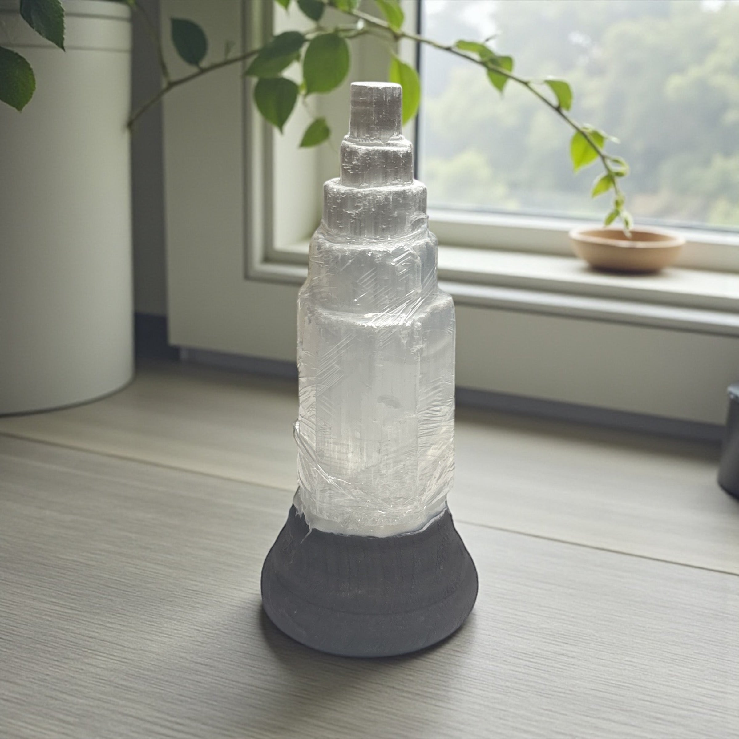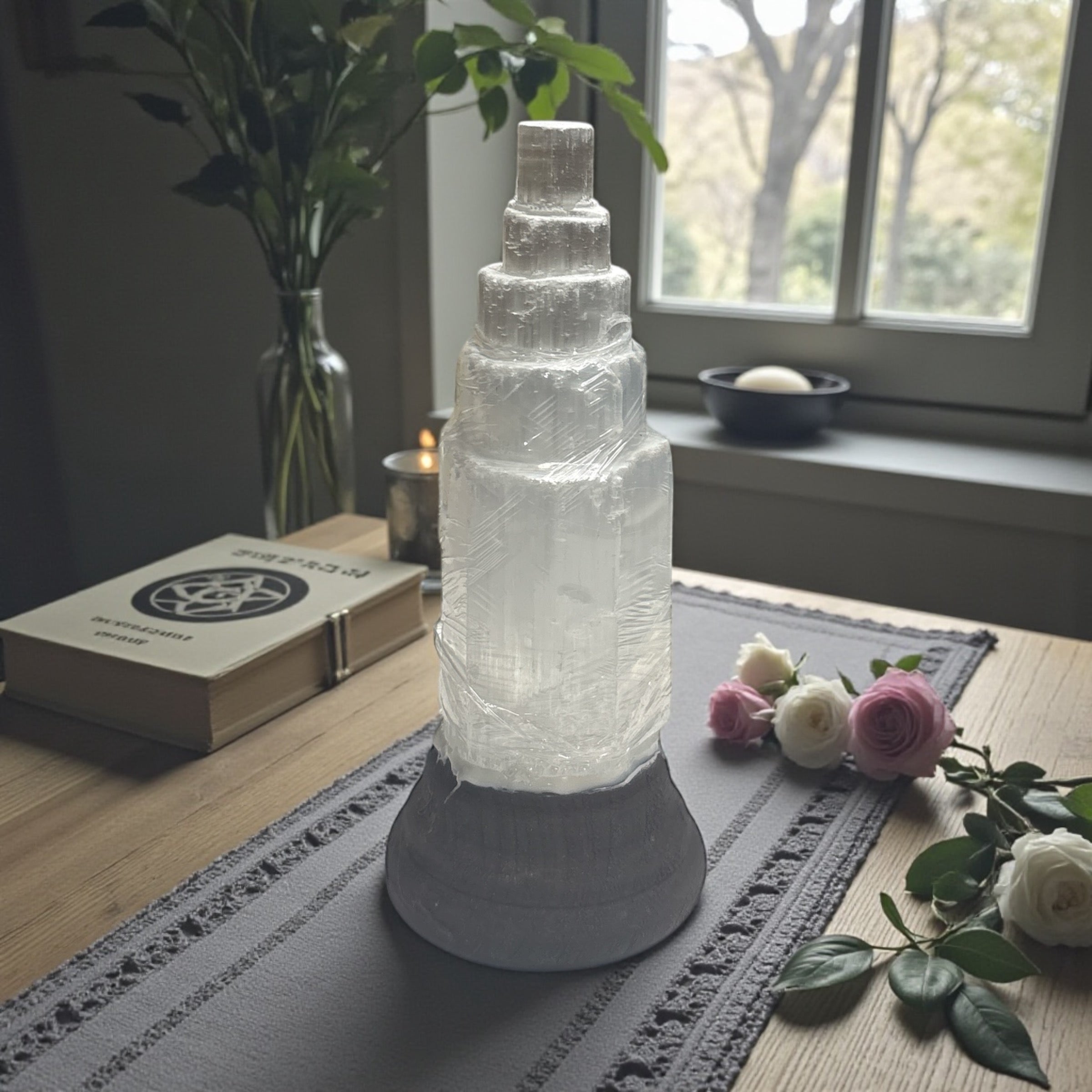 Selenite is known as one of the most powerful energy-cleansing and spiritual crystals. When illuminated, the selenite tower emits a soft, calming glow that instantly uplifts the energy of any space. Its tower shape helps channel and radiate energy upward, creating a continuous flow of peace, clarity, and protection.
