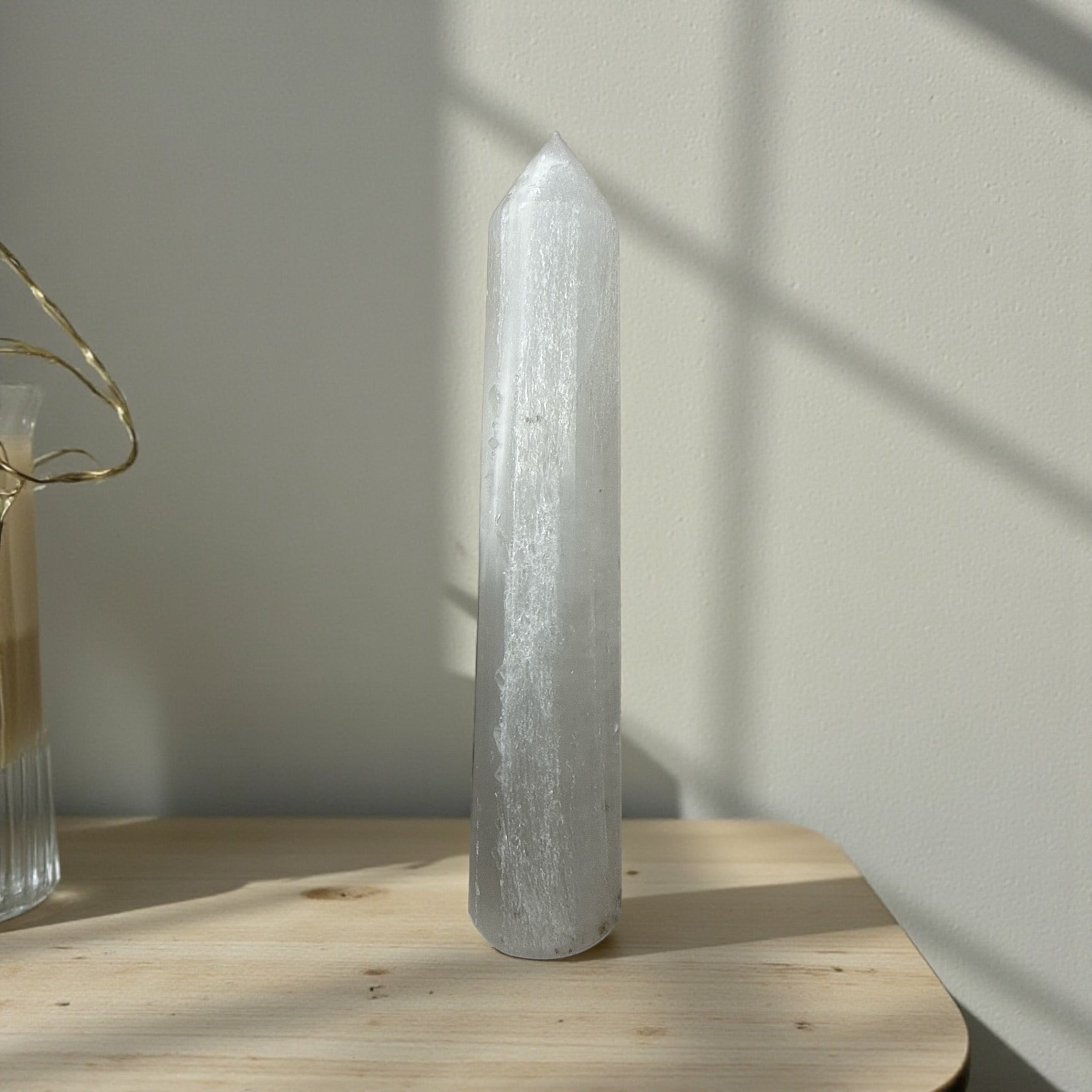 The Selenite Wand is a powerful spiritual tool for purifying energy, clearing negativity, and enhancing spiritual awareness. Selenite is known for its ability to cleanse the aura, remove stagnant energy, and elevate vibration.